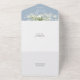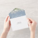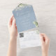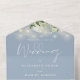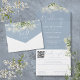 Invitación de boda completa en azul polvoriento con vegetación botánica, luces de cadena y tipografía elegante. La invitación incluye una tarjeta RSVP perforada con el código QR del sitio web de su boda y detalles. Diseñado por Thisisnotme
