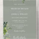 Esta invitación a la boda se lleva a cabo todo en uno, con luces de cuerda de bonito y vegetación botánica que caen sobre una tipografía elegante sobre un fondo verde sabio. La invitación incluye una tarjeta RSVP perforada con un código QR. Diseñado por Thisisnotme©
