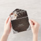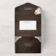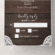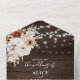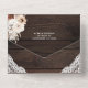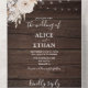 La invitación de boda rústica boho cuenta con flores neutras y luces de cuerda en un fondo de madera.