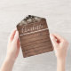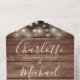 Invitación de boda todo en uno con luces de cuerda bonitas, nombres de estilo de firma y tipografía chic en un fondo de madera rústica. La invitación incluye una tarjeta de RSVP perforada con un código QR. Diseñado por Thisisnotme©