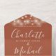 Invitación de boda todo en uno con luces de cuerda bonitas, nombre con letra de firma elegante y monograma en un fondo de terracota. La invitación incluye una tarjeta de RSVP perforada que se puede dirigir individualmente o dejar en blanco para que escriba a mano los detalles de la dirección de sus invitados. Diseñado por Thisisnotme©
