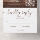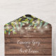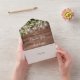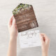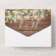 Invitación de boda todo en uno que incluye follaje de vegetación, bonitas luces de cuerda, frascos de cemento, nombres de estilo de firma y tipografía chic en un fondo de madera rústica. La invitación incluye una tarjeta de RSVP perforada que se puede dirigir individualmente o dejar en blanco para que escriba a mano los detalles de la dirección de sus invitados. Diseñado por Thisisnotme©