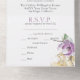 Esta romántica invitación a una boda floral presenta un diseño todo en uno con una tarjeta R.S.V.P. incluida en la parte inferior. El fondo es un blanco sencillo y elegante con flores de magnolia acuarelas. Un delicado ramo de magnolias se retrata en la parte delantera y dos en la parte interior, acentuados con un patrón de tinta de Relieve metalizado dorado.