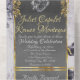 Esta elegante invitación a la boda All In One incluye un centro gris sobre un fondo de mármol blanco y negro, enmarcado con rosas y hojas de oro, adornado con un corazón de desplazamiento plateado.