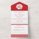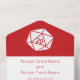 Trae un toque de diversión geeky a tu evento con esta invitación de boda todo en uno y tarjeta RSVP. En el interior se encuentra una mueca blanca de veinte lados sobre un fondo de cerezo brillante sobre una sección con un texto de muestra que se puede personalizar para su día especial. La sección inferior de la invitación incluye una pieza desmontable de tamaño postal que tiene un ejemplo de texto RSVP sentado encima de un borde rojo cereza con un patrón de d20s esparcido por la parte inferior. En el exterior, se puede encontrar un borde similar de dados de 20 lados en cerezo debajo de las áreas donde se agregarían sellos, parámetros y direcciones de retorno tanto para la invitación como para la sección RSVP que se puede devolver. La solapa usada para doblar y sellar la tarjeta tiene un solo d20 sobre un fondo rojo brillante con un conjunto de iniciales de muestra que se puede personalizar para un toque personal final que muestra su amor por los juegos de mesa y entre ellos. Asegúrese de comprobar el resto de la Moda Tabletop en Cherry set para otros productos de coordinación, incluyendo las etiquetas de dirección de retorno.