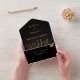 Esta elegante invitación a celebrar bodas en negro y oro es perfecta para un boda moderno. el diseño es sencillo y elegante, con una caligrafía dorada sobre un fondo negro.