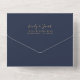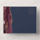 The left-hand edge of this elegant modern all-in-one wedding invitation and RSVP features a burgundy watercolor agate border trimmed with faux gold glitter. The customizable text combines gold-colored handwriting, copperplate and italic fonts on a navy blue background. The return address appears on the outside flap and the reverse side of the detachable RSVP card in gold-colored text on solid navy blue.
