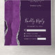 El borde izquierdo de esta elegante y moderna invitación a la boda todo en uno y RSVP cuenta con un borde de ágata color morado con falso purpurina plateado. El texto del personalizable combina la escritura a mano gris plateado, el copperplate y las fuentes cursivas en un fondo de ciruela profundo. La dirección de retorno aparece en la solapa exterior y en el reverso de la tarjeta RSVP desmontable.