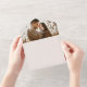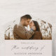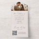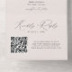 Elegante invitación de boda todo en uno con tu foto de compromiso en la parte superior del diseño. Sus nombres y detalles del boda se muestran en texto negro con acentos modernos de caligrafía en un fondo crema. El diseño incluye un código QR para que los huéspedes puedan ver los detalles del boda en línea en el sitio web de su boda. Diseñado para coordinar con nuestra colección de bodas Modern Elegance.