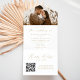 Elegante invitación de boda todo en uno con tu foto de compromiso en la parte superior del diseño. Sus nombres y detalles del boda se muestran en texto dorado con acentos modernos de escritura caligráfica en un fondo blanco. El diseño incluye un código QR para que los huéspedes puedan ver los detalles del boda en línea en el sitio web de su boda. Diseñado para coordinar con nuestra colección de bodas Modern Elegance.