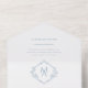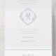 Esta invitación a la boda de marfil presenta un moderno monograma en forma de diamante en su centro, con las iniciales de la novia y del novio mostradas de manera destacada. El monograma está rodeado por una tipografía clásica en un azul polvoriento, añadiendo un toque de elegancia al diseño. Delicados detalles florales adornan aún más la invitación, dándole un ambiente romántico e intemporal. El diseño general es sofisticado y único, lo que lo convierte en una elección perfecta para un boda elegante y sofisticado.