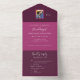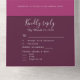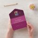 Todo esto en una tarjeta de invitación a la boda es especial. Obtienes tu tarjeta de invitación y la tarjeta RSVP todo en uno. Puedes personalizar la moderna y elegante tarjeta de invitación a la boda con tu foto de pareja, Intro, nombres, ocasión, fecha, dirección, rsvp, comidas y otros colores de fondo a tus preferencias. Incluso la imagen es cambiable. Se mezcla armoniosamente con tonos morados y bayas, y se trata de una tipografía blanca adecuada. El diseño es minimalista y está decorado con tonos morados y bayas. Puedes sellar con elegancia y mandar esta invitación tridoblada a una boda económica. Enviar la tarjeta postal RSVP de vuelta al remitente. Haz que este diseño especial sea tuyo y sientas como el príncipe y la princesa en tu futuro boda. Hobinishop