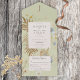 Este diseño presenta un campo delicado y flores silvestres y helechos sobre un fondo verde salado claro. Un monograma completa el aspecto sencillo pero elegante de todo esto en una sola invitación. Las invitaciones todo en uno personalizadas son una combinación única de una invitación personalizado bien impresa y una postal RSVP fácil de desgarrar. ¡Y son tan fáciles de usar! Simplemente se pliega, después sella la solapa de atrás con los tres pegatinas claros incluidos y el correo. Y cuando sus invitados reciben la invitación de su personalizado, ¡simplemente sacan la tarjeta RSVP perforada y la envían de vuelta al correo! Esta tarjeta es parte de la suite de tarjetas Wildflowers on Light Sage Boda creada por Simply Farmhouse Press.