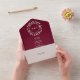 Todo en una invitación de boda con un laurel decorativo con guirnaldas florales y borde dorado que contiene sus iniciales en monograma sobre un fondo borgoñón. La invitación incluye una tarjeta RSVP perforada que puede ser dirigida individualmente o dejada en blanco para que usted escriba a mano los detalles de la dirección de su invitado. Diseñado por Thisisnotme©