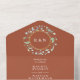 Todo en una invitación de boda con un riachuelo decorativo de garland floral y borde dorado que contiene sus iniciales en monograma sobre un fondo de terracota. La invitación incluye una tarjeta RSVP perforada que puede ser dirigida individualmente o dejada en blanco para que usted escriba a mano los detalles de la dirección de su invitado. Diseñado por Thisisnotme©