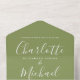 Todo en una invitación de boda con un nombre de guión de firma elegante e iniciales de monograma en un fondo verde musgo. La invitación incluye una tarjeta RSVP perforada que puede ser dirigida individualmente o dejada en blanco para que pueda escribir a mano los detalles de la dirección de su invitado. Diseñado por Thisisnotme©