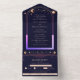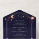 Mystical Rainbow Sun Star Moon Astronomy Space All In One Wedding Invitation presenta sol plateado, luna y estrellas con un marco de color arcoiris sobre un fondo azul oscuro. Adentro está tu información de invitación de boda personalizada. Debajo está la tarjeta extraíble RSVP con tres opciones de comida para que los huéspedes la retiren y regresen. Personalice editando el texto en los cuadros de texto. Para un número adicional de opciones de comida con este diseño visite nuestra tienda y vea nuestra colección. El tipo de comida se puede cambiar simplemente editando el texto en la sección de personalización de este diseño. Diseñado por ©Evco Studio www.zazzle.com/store/evcostudio