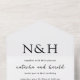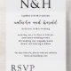 Moderno todo en una sola invitación de boda con un diseño sencillo y mínimo en blanco y negro con tu monograma en negrita junto con tus nombres en un elegante guión de escritura a mano.