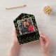 Este diseño audaz y colorido hará una declaración memorable esta temporada de fiestas. Esta tarjeta de festividad presenta una única plantilla de foto retrato con un patrón holly rojo y verde profundo y un borde blanco ondulado sobre un fondo negro. Los paneles cuentan con gráficos complementarios, campos de texto editables y una gran foto de tearaway keepsake.