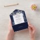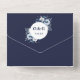 Esta invitación a la boda se lleva a cabo todo en uno y cuenta con elegantes flores azules y blancas de la marina, luces de cuerda y tipografía moderna. La invitación incluye una tarjeta RSVP perforada que puede ser dirigida individualmente o dejada en blanco para que pueda escribir a mano los detalles de la dirección de su invitado. Diseñado por Thisisnotme©