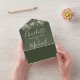 Todo en una invitación de boda con luces de cuerdas de bonito, jarras de albañil, nombres de estilo y tipografía de moda en un fondo verde oliva. La invitación incluye una tarjeta RSVP perforada con un código QR. Diseñado por Thisisnotme©