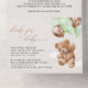 Invite a sus amigos y familiares con estilo y establezca el tono de su día especial con esta encantadora invitación a la ducha de bebé. El diseño presenta un oso de peluche con globos verdes de fondo beige.