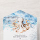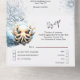 Un bonito diseño de playa de verano con un pulpo blanco tintado de naranja frente a las olas del océano azul. Un segundo pulpo blanco aparece en la lágrima de la tira de rsvp en la parte inferior y un tercio en la parte posterior. Este elegante diseño se sitúa sobre un fondo blanco que tiene plantillas negras para su redacción personalizada. Esta agradable invitación es ideal para el destino costero; bodas tropicales, costeros y de playa.