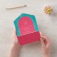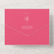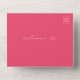 Ilustracion de arte de línea blanca de hojas de palma patrón sobre fondo azul con texto blanco y diseño de concha sobre arco rosa con borde blanco. El exterior es rosa, con dirección de retorno y ilustracion de hojas de palma en la solapa. Rsvp presenta código qr.