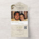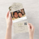 Invitación formal a la boda de Palm Trees. Una elegante palmera forma parte del dosel sobre los nombres de Bride y Grooms. Cambie fácilmente la información para su propio diseño personalizado. Cambie la imagen del titular del lugar con su propia foto. El código QR se puede eliminar si no es necesario. Elegante diseño boda formal.