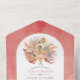 Hojas de palma secas tropicales, pasto de pampas y flores de protea rosadas todo en una sola invitación a la boda. Este bonito diseño boda presenta un marco de arco sobre fondo manchado de color rosa y una tarjeta RSVP independiente. En el marco, un ramo de hojas de palma secas, flores de protea y pasto de pampas.