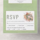 Hojas de palma secas tropicales, pasto de pampas y flores de protea saltan arco verde en una sola invitación a la boda. Este bonito diseño boda presenta un marco de arco sobre fondo verde salado y una tarjeta RSVP independiente. En el marco, un ramo de hojas de palma secas, flores de protea y pasto de pampas.