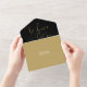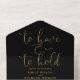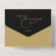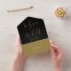 Esta invitación de boda minimalista todo en uno presenta una elegante tipografía dorada sobre un fondo negro. La invitación incluye una tarjeta de RSVP perforada que se puede dirigir individualmente o dejar en blanco para que pueda escribir a mano los detalles de la dirección de sus invitados. Diseñado por Thisisnotme©