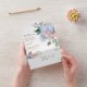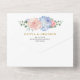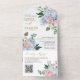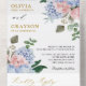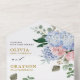 Moderno boda todo en una invitación con hidrangeas de color azul claro/ azul polvoriento con rosa pastel , rubor, melocotón , rosas blancas, peonías, hojas de eucalipto salado, ramas y follaje. Tonos suaves y ondulados románticos primavera verano acuarela diseños florales para coincidir con tu boda temático.