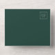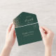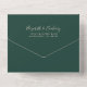 The left-hand edge of this elegant modern all-in-one wedding invitation and RSVP features a peach faux glitter border. The customizable text combines peach whimsical handwriting, copperplate and italic fonts on an emerald green background. The return address appears on the outside flap and the reverse side of the detachable RSVP card in peach text on solid green.