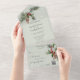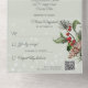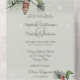 Captura la magia de un maravilloso país invernal con esta exquisita invitación a la boda todo en uno, cuidadosamente diseñada para encarnar la elegancia y el encanto de tu día especial. Que el encanto de las ramas de pino, los conos de pino, el holly y la caída de la nieve teje la historia de tu amor en un tapiz mágico que dejará una marca indeleble en los corazones de todos los que la reciben. Las invitaciones de boda todo en uno son hermosas y prácticas al combinar la invitación de boda con una postal RSVP fácil de quitar perforada. También son rápidos y fáciles de preparar para el correo. Simplemente dirija la invitación, doble el pliegue trasero y selle con los pegatinas claros incluidos. Una vez que sus invitados reciben la invitación, simplemente rompen la tarjeta RSVP perforada y la tiran por correo. La adición del código QR permite a los clientes acceder fácilmente a la página web de su boda para obtener información, incluyendo detalles de recepción y opciones de cena.