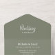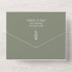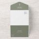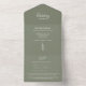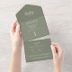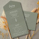 Invitación Rústica Sage Green All in One Wedding, con un simple pino y un sencillo diseño de tipografía. Con letras de personalizable, agrega su propia información. El centro externo está en blanco para que agregue direcciones de invitados. También hay una tarjeta RSVP para sus huéspedes. Ideal para simplificar la planificación de su día especial.