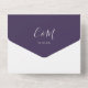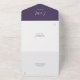 Todo en una invitación de boda con elegante nombre de guión de firma y iniciales de monograma en un fondo morado. La invitación incluye una tarjeta RSVP perforada con el código QR de su sitio web boda y detalles. Diseñado por Thisisnotme©
