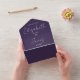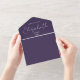 Esta minimalista invitación a la boda todo en uno muestra una tipografía elegante con un fondo morado. La invitación incluye una tarjeta RSVP perforada con el código QR de su sitio web boda. Diseñado por Thisisnotme©