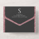 DISPONIBLE CON O SIN CÓDIGO QR PARA ESCAPAR EN LA ZONA RSVP O CON O SIN OPCIONES PARA CENAR. Este diseño es sencillo pero elegante, con la última inicial del novio o de la novia en la solapa exterior y en la parte superior interior. La frontera es un falso purpurina rosa. Agregue un código QR personalizado a su invitación para que los asistentes puedan acceder rápidamente a su sitio Web boda para obtener detalles, direcciones, opciones de menú y más, o agregue la dirección URL Web del Registro de regalos. Las invitaciones todo en uno personalizadas son una combinación única de una invitación personalizado bien impresa y una postal RSVP fácil de desgarrar. ¡Y son tan fáciles de usar! Simplemente se pliega, después sella la solapa de atrás con los tres pegatinas claros incluidos y el correo. Y cuando sus invitados reciben la invitación de su personalizado, ¡simplemente sacan la tarjeta RSVP perforada y la envían de vuelta al correo!