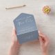 Anuncio de fuga o boda pequeña elegante en azul polvoriento combinado con una invitación a la recepción después de la boda. "Fiesta Felices para Siempre" está escrito en una mezcla de tipografía blanca simple y una escritura moderna blanca. Una tarjeta postal de respuesta desprendible proporciona una respuesta conveniente y ecológica sin sobre de sus invitados.