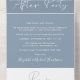 Anuncio de fuga o boda pequeña elegante en azul polvoriento combinado con una invitación a la recepción después de la boda y una tarjeta postal de respuesta desprendible para una respuesta conveniente y sin sobres de sus invitados. "Fiesta Felices para siempre" está escrita en una mezcla de tipografía blanca simple y una escritura blanca moderna.