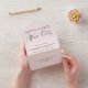Anuncio de fuga y boda pequeña elegante rosa claro combinado con una invitación a la recepción después de la boda. "Fiesta Felices para Siempre" está escrito en tipografía simple y letra moderna. Una tarjeta postal de respuesta desgarrable proporciona una respuesta conveniente y ecológica y sin sobre de sus invitados.