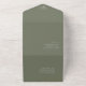 Una pintura pinta una acuarela en tonos brillantes de verde oliva con toques de lavanda que acentúan las piezas de esta hermosa suite boda. La invitación de boda "todo en uno" y el RSVP que se muestran aquí también incluyen una caligrafía escrita a mano elegante y una plantilla para añadir fácilmente sus propios nombres y detalles del evento. Busque ID886 para ver otras piezas y opciones de color para este conjunto.