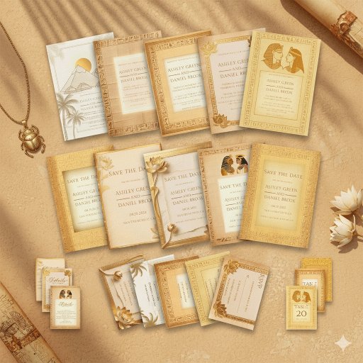 Celebrate your love story with ancient elegance through this Egyptian wedding invitation, inspired by the rich history of Ancient Egypt. Designed with the pyramids of Giza in the background and palm trees, this invitation brings a sense of royalty and romance to your wedding day.