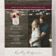 Esta encantadora invitación de boda rústica todo en uno presenta un fondo de madera oscura con luces de cuerda brillantes, hierba de pampas rosada, flores de borgoña y un motivo de frasco de mason con monograma personalizado. Incluye RSVP incorporado, una sección de fotos y un espacio para su sitio web de boda y dirección de devolución. Una opción acogedora y ecológica para bodas de granero, al aire libre o de otoño.