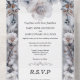 Una hermosa invitación a acuarela todo en uno con flores de color gris azul, marrón y gris claro bonito; conos de pino cappuccino, bayas naranjas oscuras y ramas foliares de plata de marfil. El tercio inferior tiene una tarjeta de respuesta desgarradora con dirección rsvp personalizada para que sus invitados la completen. Son ideales para celebraciones de invierno, rústicas de campo o otoño, así como para fiestas temáticas de bosques.