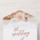 Un elegante boda de temática bohemiana de terracota de otoño, todo en una sola invitación con RSVP. Esta invitación incluye una carta caligráfica acentuada con rosas de acuarela a mano, pasto de pampas y hojas de palma.