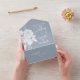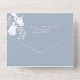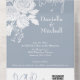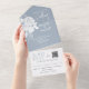 Delicadas siluetas blancas de rosas sobre un suave fondo azul polvoriento le dan a esta invitación a una boda todo en uno, amigable con el presupuesto, un aspecto moderno y de moda. El RSVP desgarrador es una tarjeta de correo postal, o sus invitados pueden escanear el código QR del personalizable para todos sus detalles bodas.