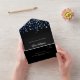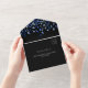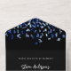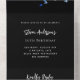 Un fondo negro, decorado con un confeti azul marino. Personalice y agregue nombres, detalles del fiesta, fecha RSVP, dirección de devolución y nombre. Texto blanco.