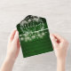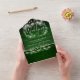 Todo en una invitación a la boda con luces de cuerda de bonito, una guirnalda floral hecha a mano y una tipografía de moda sobre un rústico fondo de paneles de madera verde esmeralda. La invitación incluye un RSVP perforado con el código QR de su sitio web boda y detalles. Diseñado por Thisisnotme©